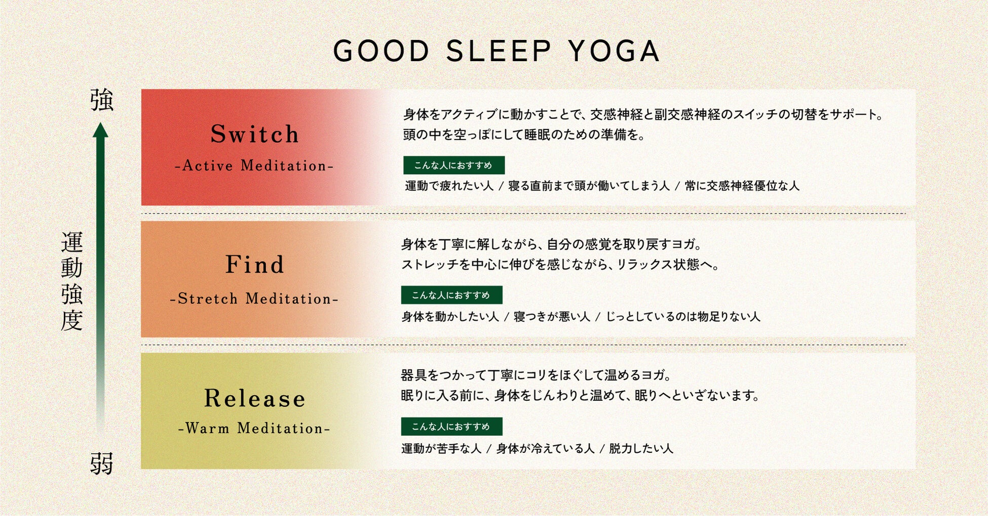 ■ 強度と体調に合わせてできる3つのヨガプログラムで、その日にあった心地よさを。
