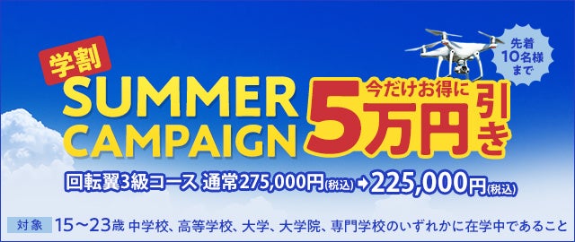 そこで今回は、学生を対象に夏季休暇に合わせてドローン資格である「ドローン操縦士回転翼3級」を特別価格で取得できるキャンペーンを7月1日~8月28日まで実施致します。