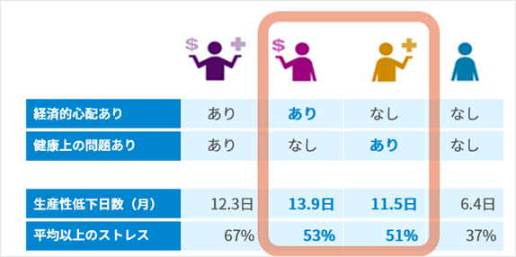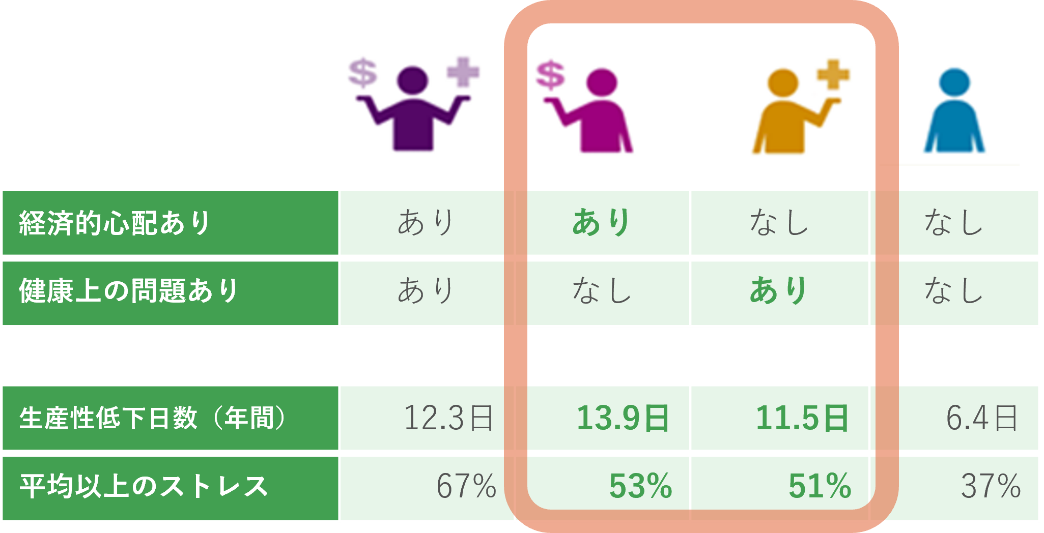 一方で生産性向上には、健康経営で対象になっている身体的な健康だけでなく、経済的な健康(不安の緩和・解消)も影響することが指摘されています。例としてウイリス・タワーズワトソンの「経済的健康・身体的健康とエンゲージメントの関係」に関するGBA調査(※3)から、健康上の問題がある方に対し、経済的な心配がある方の生産性への影響は同等以上にあることが明らかになっており、生産性向上という観点においては従業員のファイナンシャル・ウェルビーイングの向上も重要であると言えます。