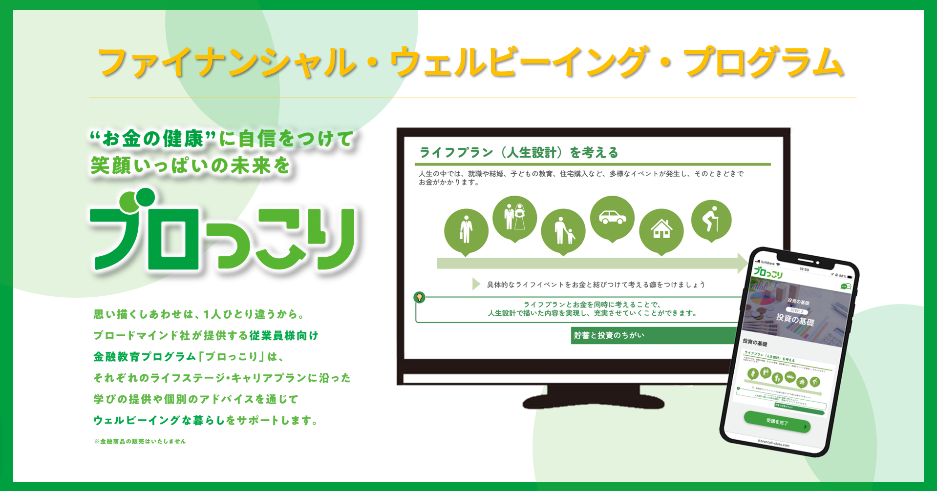 「金融の力を解き放つ」をパーパスに掲げ、保険・証券・住宅ローンと複数の金融商品を横断して1社で取り扱い、人々のライフプラン実現をサポートするブロードマインド株式会社(本社:東京都渋谷区 代表取締役社長:伊藤清 証券コード:7343 以下:当社)は、この度、健康経営を包含する概念であるウェルビーイングを構成する要素のうち「ファイナンシャル・ウェルビーイング」に焦点を当てたプログラム『ブロっこり』を開発、企業従業員向けに本日より提供を開始いたします。