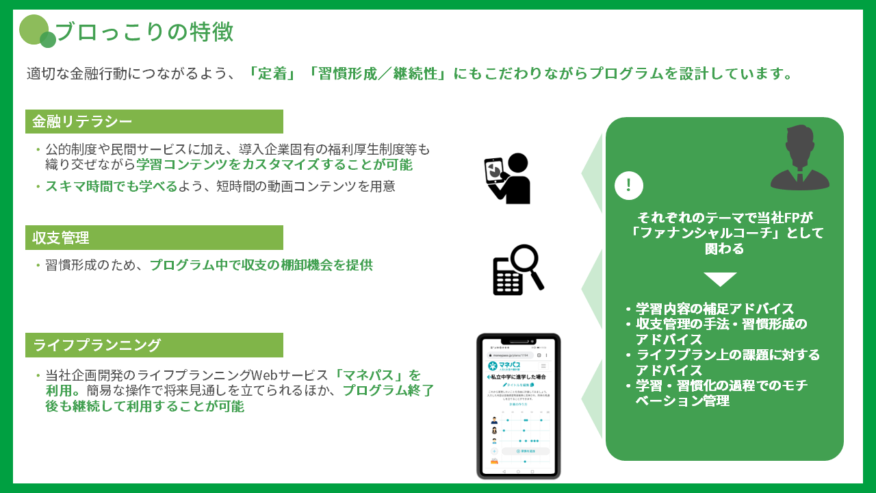 当社は、真にファイナンシャル・ウェルビーイングの状態になるためには、金融リテラシーの向上(金融知識と活用方法が分かっていること)だけでなく、資産を確保するための収支管理が継続的に出来ること、一時的ではなく長期的視点で資産計画が立てられること、そして、生産性向上という観点からは、これらが金融に対し関心の低い「本来学ぶべき従業員」にも広く定着するような仕掛けも重要だと考え、「ブロっこり」を開発いたしました。