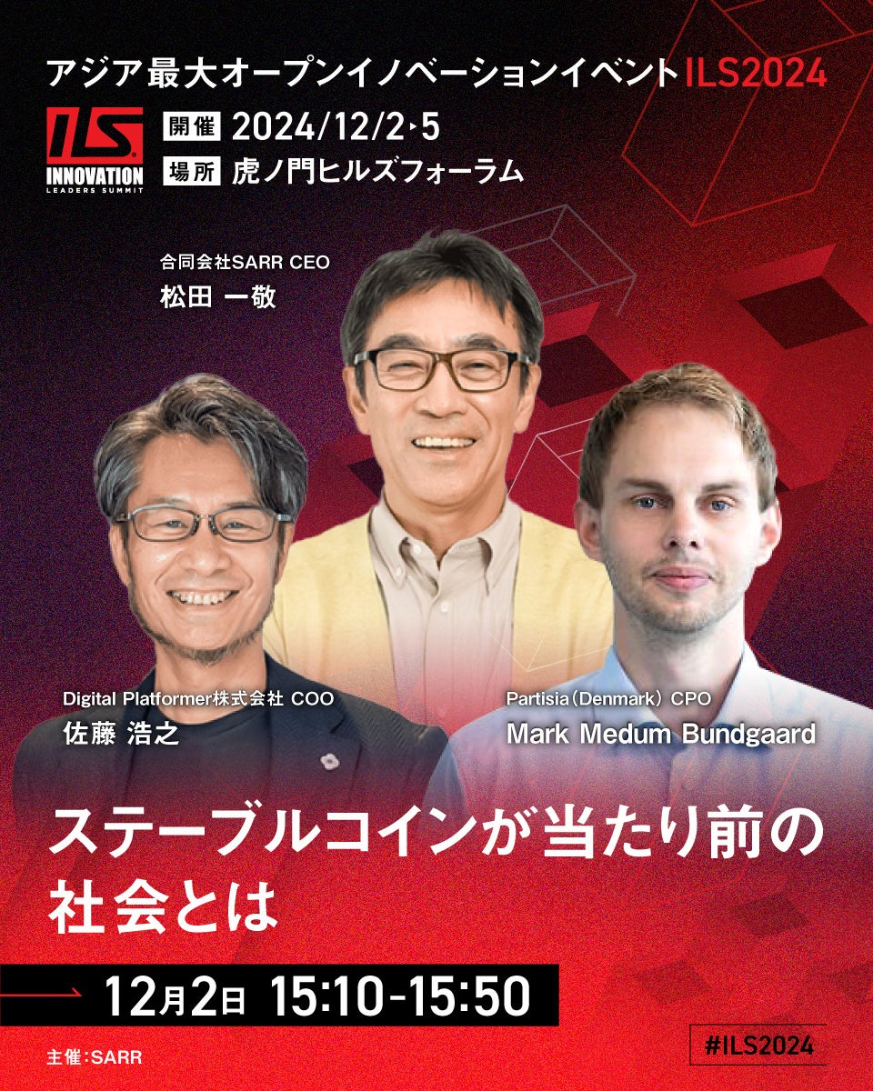 デジタルプラットフォーマー株式会社(東京都千代田区 代表取締役 松田一敬)のCEO松田とCOO佐藤が、2024年12月2日に開催されるInnovative Leaders Summit 2024(ILS2024)に登壇し、「ステーブルコインが当たり前の社会とは」にて講演を行います。