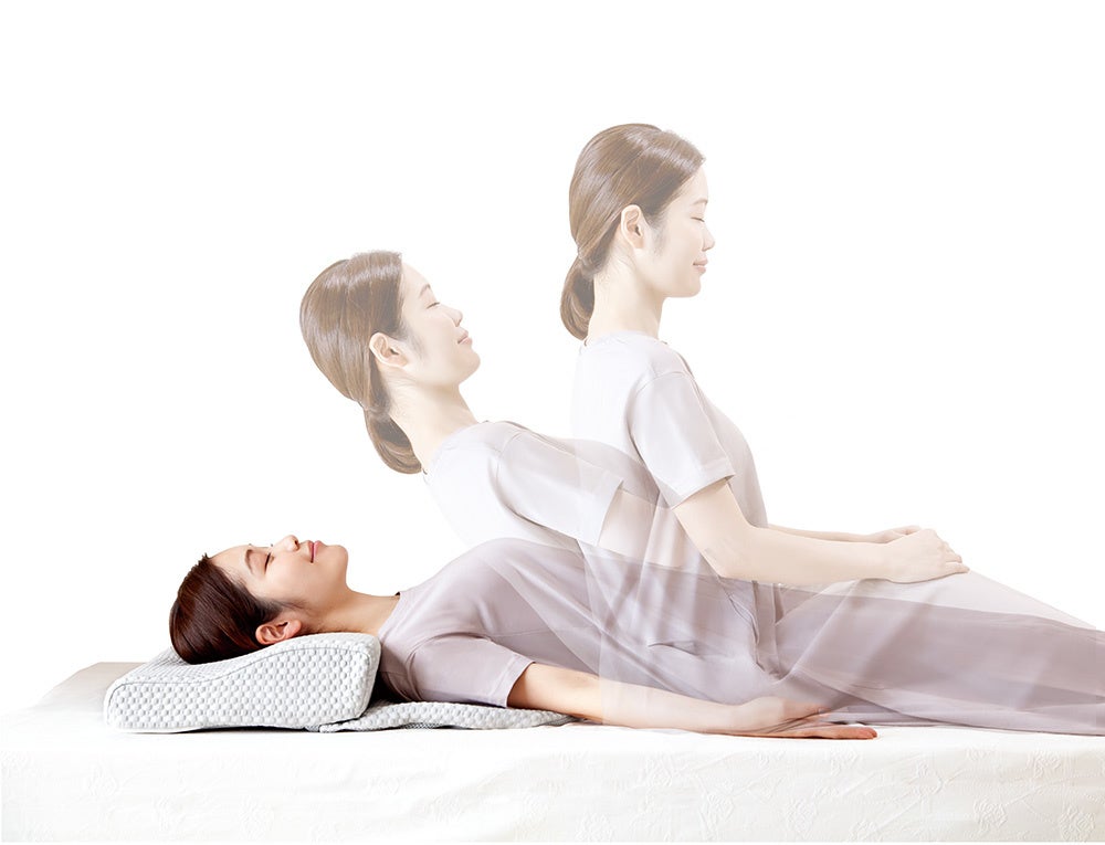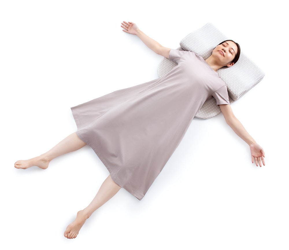 「Dr.resetととのう枕」は頭を乗せた瞬間に深く広がるカラダと呼吸。背中を押し伸ばし、胸が開きます。