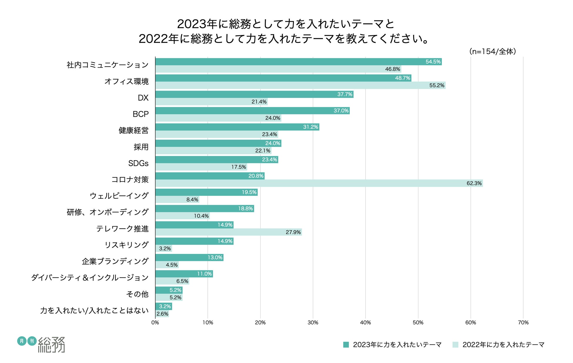 - 2023年に総務として力を入れたいテーマは「社内コミュニケーション」がトップ