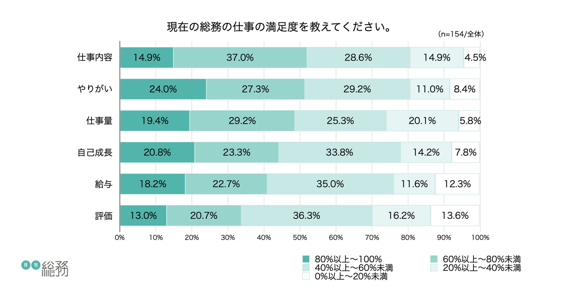 仕事内容ややりがいの面で自身の中では満足を得られている傾向にあるため、次はその仕事の成果を総務自身もうまくアピールし、社内の評価につなげていただければと思います。