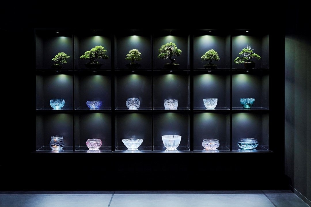 日本の伝統工芸である江戸切子と、そのなかを泳ぐ金魚、さらに日本の伝統文化である盆栽を棚に飾ります。江戸切子は根本幸昇氏の作品を、盆栽は盆栽師・平尾成志氏の作品を展示します。