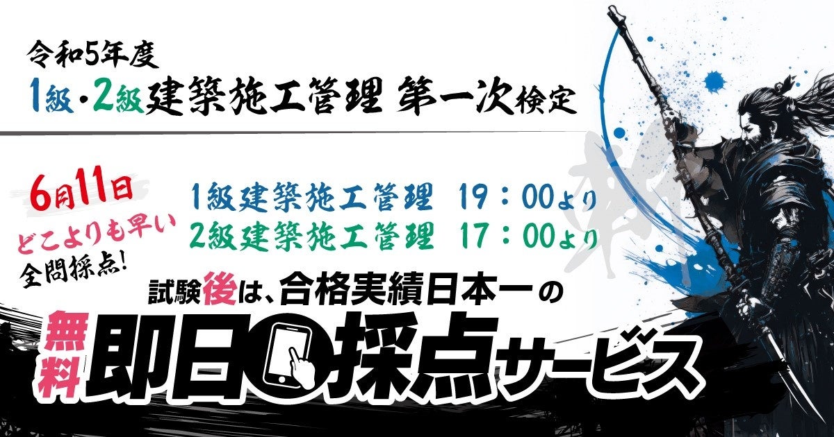 【2023年度1級・2級建築施工管理技術検定】無料「即日採点サービス」1級19:00、2級17:00より採点結果配信!試験当日6/11(日)11:00~受付開始【総合資格学院】