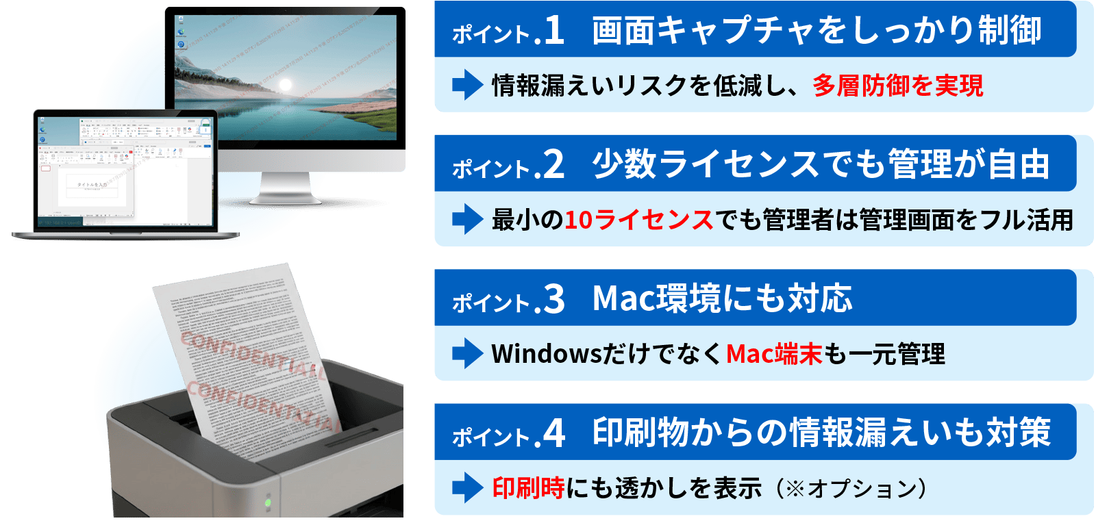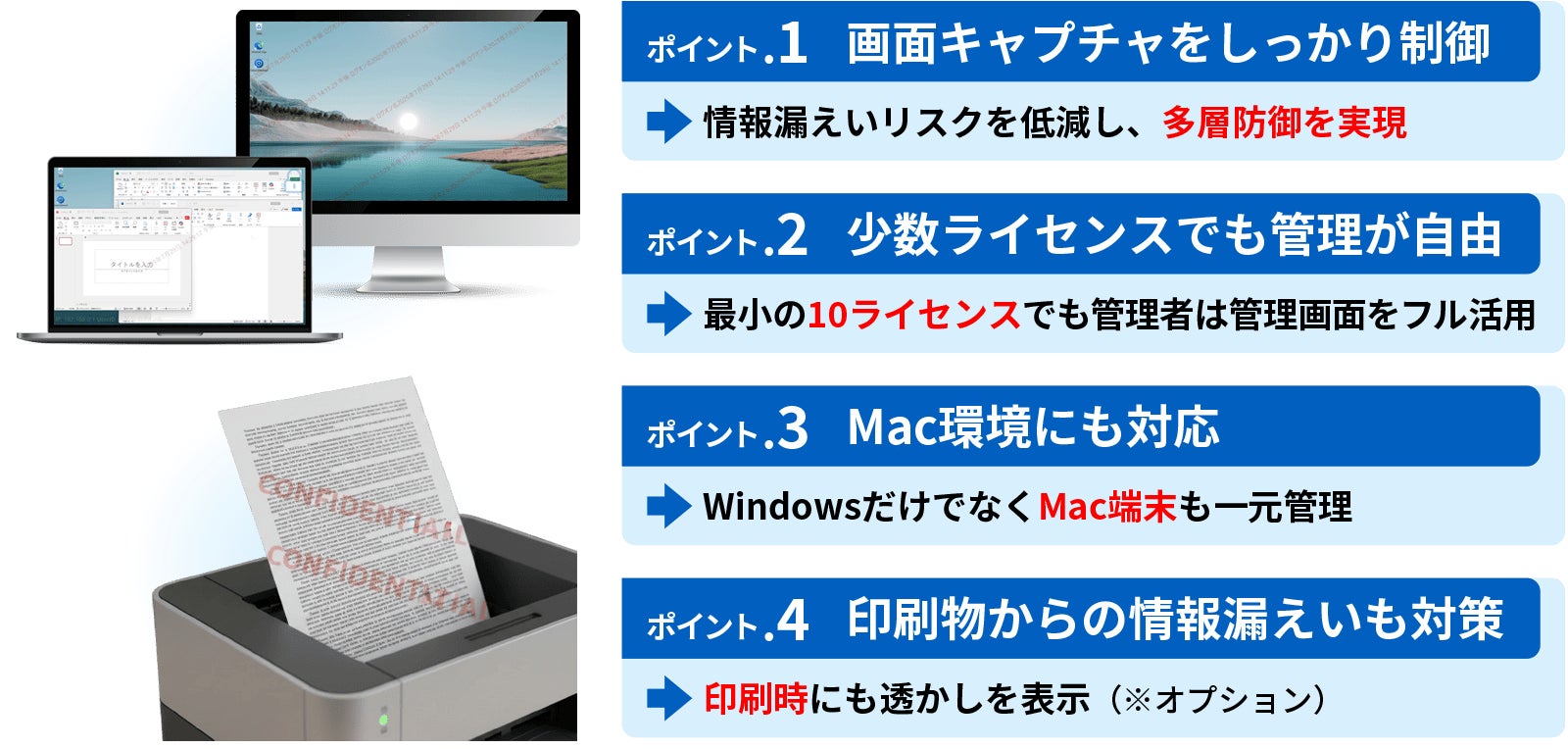 「スクリーンウォーターマーク」 は、PC画面上にユーザー名・IPアドレス・日時などを透かし表示し、スクリーンショットやスマホ撮影による情報持ち出しを抑制するソフトウェアです。