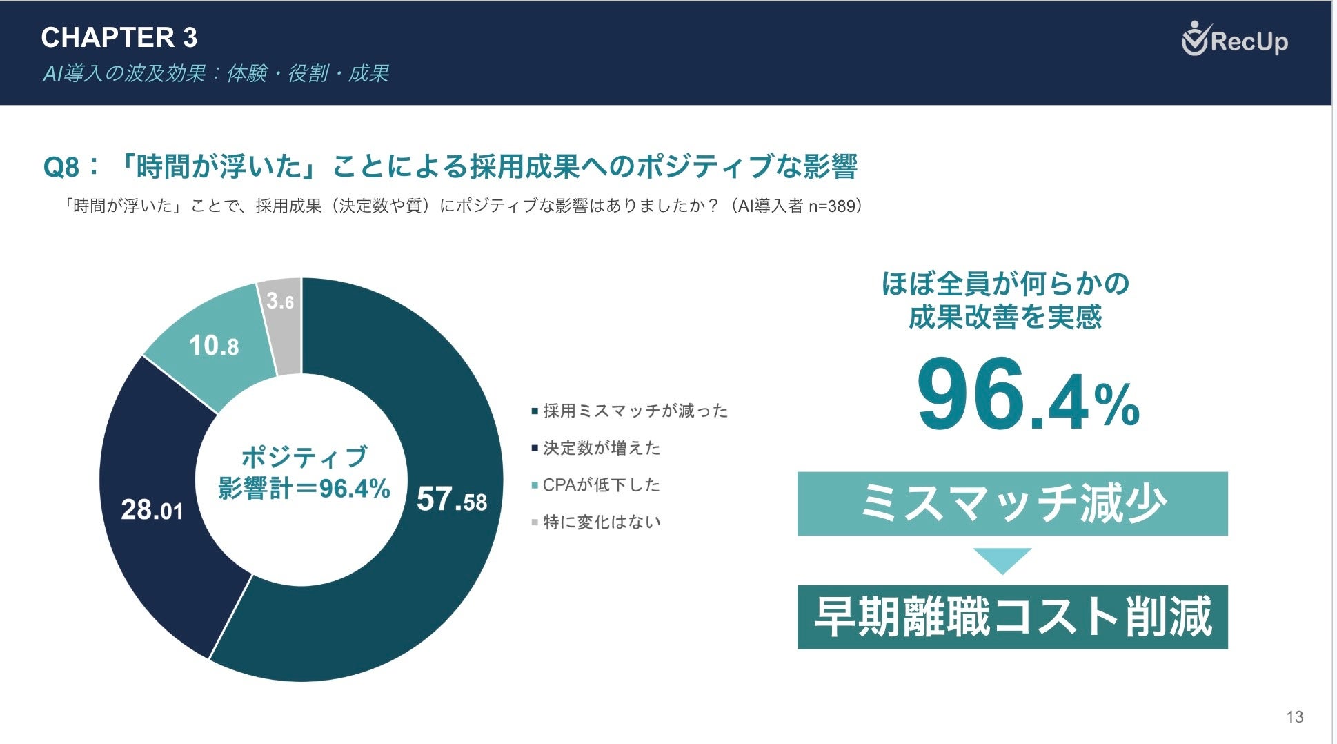 AI導入の効果は「決定数増」以上に「ミスマッチ減少(57.6%)」に現れています。創出した時間で候補者と深く向き合うことで、コミュニケーションの質が向上し、採用の質そのものを高める因果連鎖が実証されました。