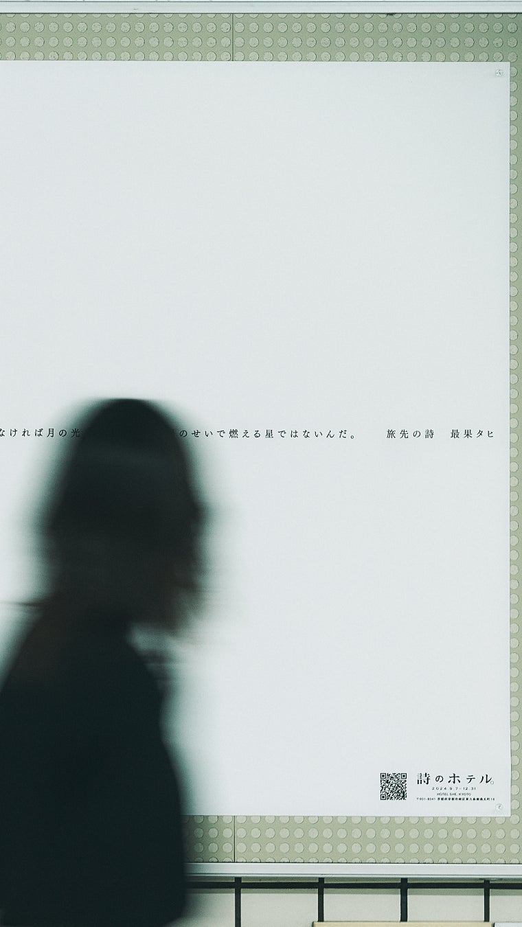 さらに今回は9月7日の宿泊開始に先駆けて、京都市後援、京都市交通局協力のもとで「詩のホテル」と連動した特別な展示をスタート。「旅のすべてが詩だったら?」というコンセプトのもとホテルを飛び出し、HOTEL SHE, KYOTOが位置する京都市南区の周辺地域(銭湯、周辺店舗など)にも最果さんが書き下ろした「詩の広告」を順次展示します。「詩の広告」をはじめとする本プロジェクトの印刷物の印刷・展示については、関西を中心に幅広い印刷を手がける株式会社カンプリの技術協賛のもとで実施をいたしました。