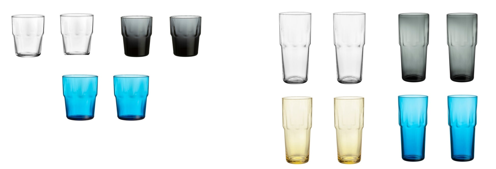(右)ソラーレ トールグラス ペア クリア / スチールグレー / エレクトリックブルー / ファイヤーイエロー 税抜¥14,000/ 税込¥15,400