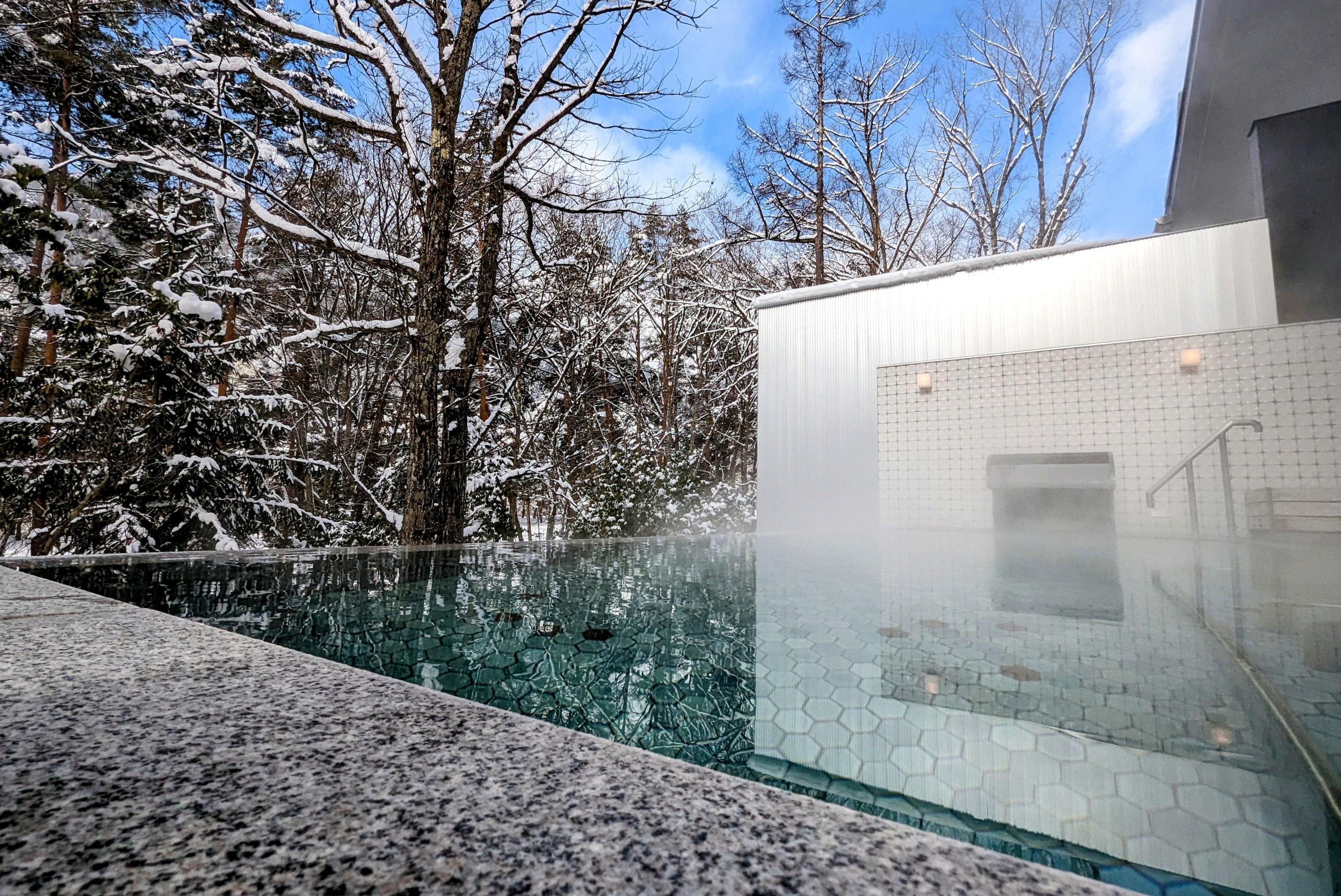 天然温泉で温まったら一面の雪景色がのぞめるインフィニティ仕様の露天風呂と外気浴で整いタイムを。