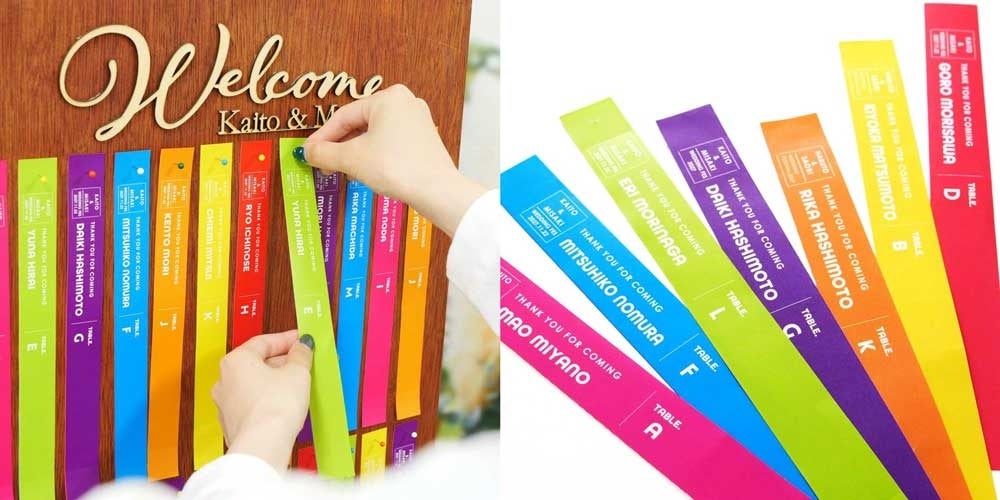 例えば、「音楽テーマ」「フェステーマ」だと、チケットやリストバンドを模した当日アイテムは演出にもなると人気が高いです。半券がピリピリとちぎれる仕様にしたり、エスコートカードをフェスのリストバンドのように手首に巻ける仕様にしたり、ちょっとした本物らしいエンタメ性が加わると、グッとそのテーマへの没入感が深まります。