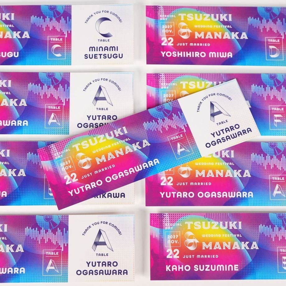 電子的なグラデーションと音を想像する幾何学模様で音色を表現した、大人気の「半券付きチケット風エスコートカード」。入り口でちぎって会場へご案内するスタイルはまるでイベント会場みたい!