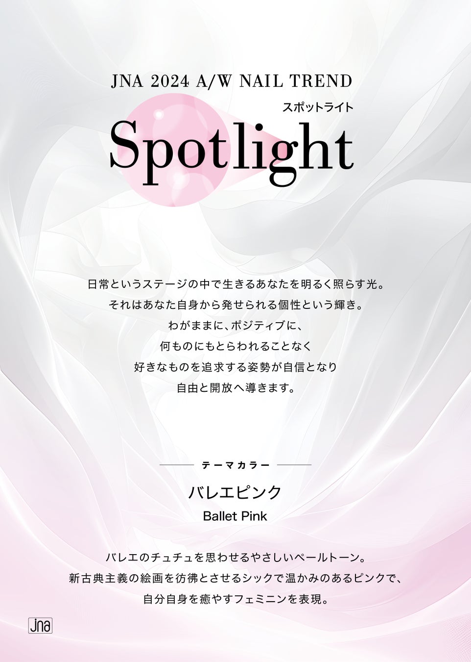 NPO法人日本ネイリスト協会(略称:JNA、所在地:東京都千代田区、理事長:仲宗根幸子)は、2024年秋冬のネイルトレンドのテーマを「スポットライト」とし、このテーマを表現する作品を発表します。