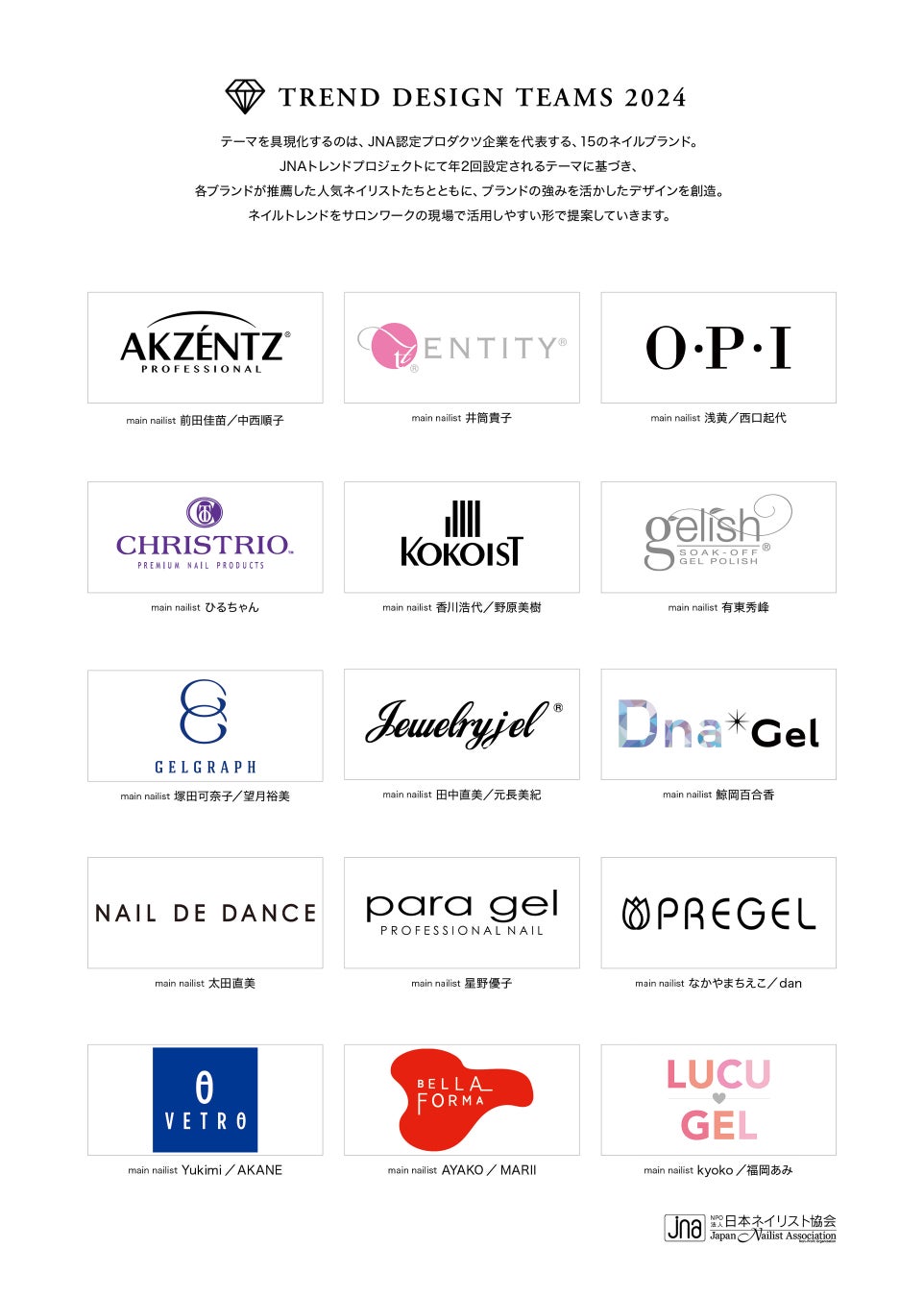 このネイルトレンドは、世界的なファッションの潮流なども踏まえ、「JNA ネイルトレンドプロジェクト(プロジェクト長 木下美穂里)」 が年2回設定し、発表しています。日本ネイリスト協会メンバーに、ネイルトレンドアドバイザーとしてモデル/ビューティジャーナリストSAKURAさんを迎え、熟考し作り上げたテーマを元に、JNAトレンドデザインチーム(JNA認定プロダクツ企業から選抜されたネイルブランドと一流ネイリスト)が、ネイルサロンのお客様に提供するアイディアとして、ネイル作品制作を担当しています。