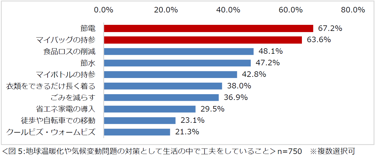 具体的な対策としては、6割以上が「節電」や「マイバッグの持参」を実施。