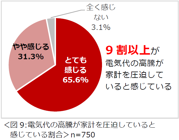 「現在、電気代の高騰が家計を圧迫していると感じますか?」という設問に、6割以上が「とても感じる」と回答。「やや感じる」と合わせると、9割以上の人が家計の圧迫を感じていることが分かりました(図9)。