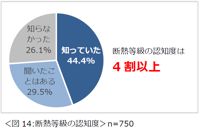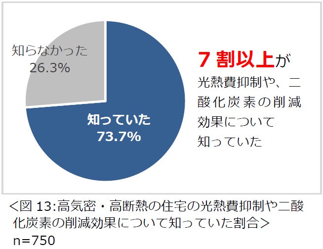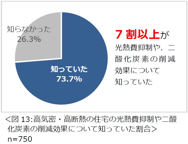 続いて、「高気密・高断熱の住宅は、光熱費の抑制や、二酸化炭素の削減に効果があることを知っていましたか?」と尋ねたところ、7割以上の人が「知っていた」と回答しました(図13)。