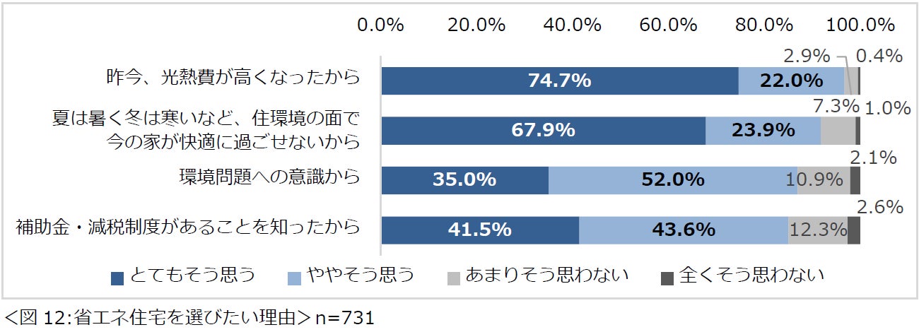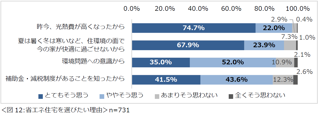 省エネ住宅を選びたいかどうかの質問に、「とてもそう思う」「ややそう思う」と回答した731人に図12の4つの項目がそれぞれどの程度、省エネ住宅を選びたい理由として当てはまるか答えてもらったところ、「とてもそう思う」と「ややそう思う」を合わせた割合が最も多かったのは「昨今、光熱費が高くなったから」で、9割以上の人が回答。また、「夏は暑く冬は寒いなど、住環境の面で今の家が快適に過ごせないから」についても、9割以上にのぼりました(図12)。