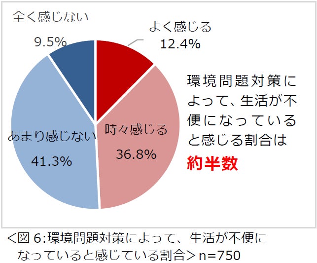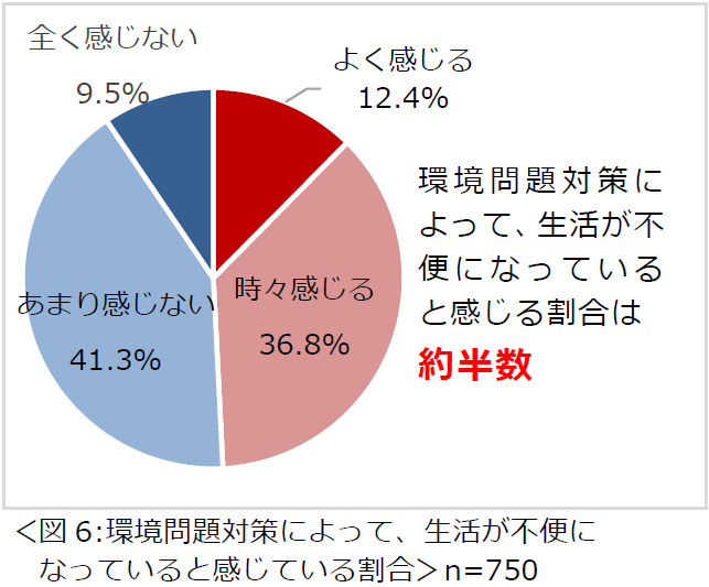 続いて、「プラスチック削減施策や再生可能エネルギーの拡大など、環境問題対策によって、生活が不便になっていると感じることがありますか?」との設問に、「よく感じる」または「時々感じる」と回答した人の割合は、約半数でした(図6)。