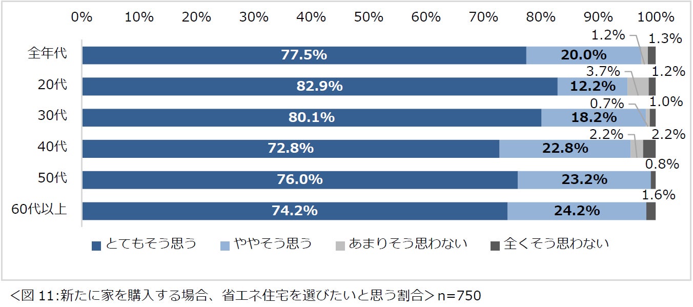 「今後、新たに家を購入する場合、省エネ住宅(※)を選びたいと思いますか?」と質問したところ、8割近くが「とてもそう思う」と回答しており、「ややそう思う」を含めるとほとんどの人が省エネ住宅を選びたいと考えていました。また、年代別で見ると、「とてもそう思う」と回答した割合は、特に20代と30代で8割を超え、他の世代よりも高くなりました(図11)。