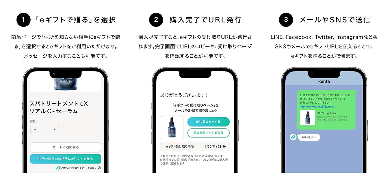 「AnyGift(エニーギフト)」は、相手の住所がわからなくてもLINEやメールでギフトを贈ることができるサービスです。本サービスの導入により、スパトリートメント公式オンラインショップにて、対象のアイテムをeギフトとして贈ることができるようになります。