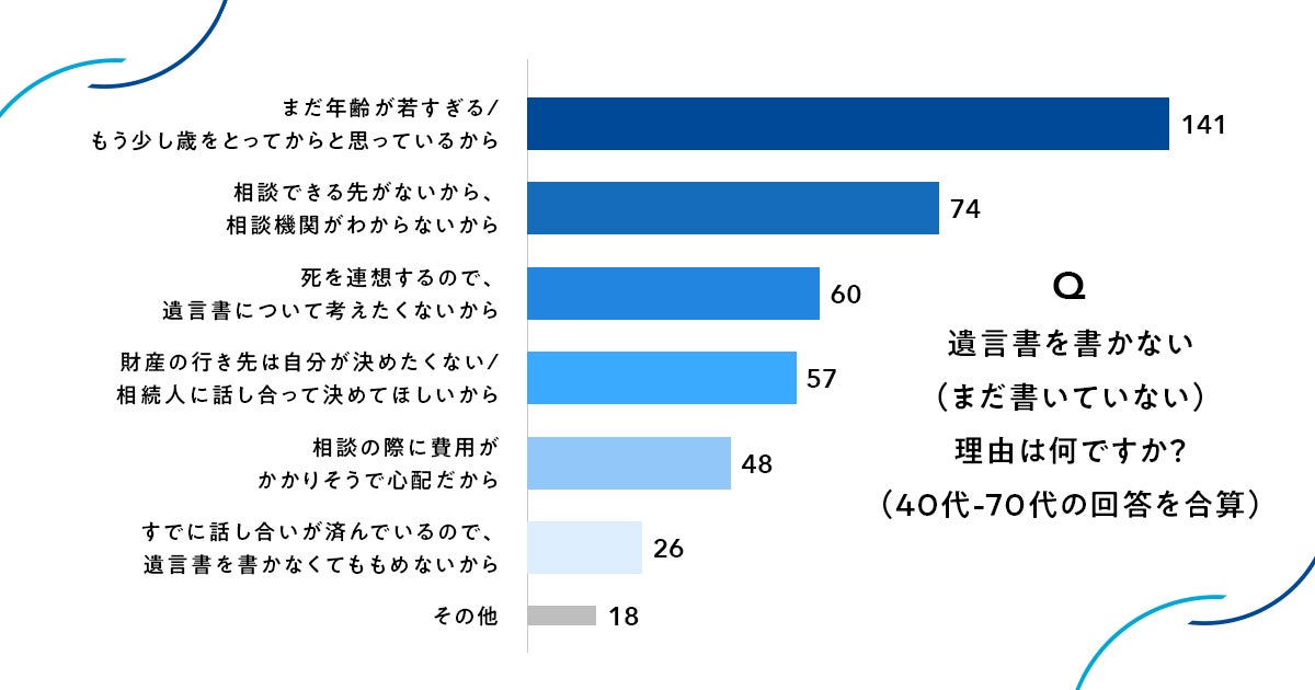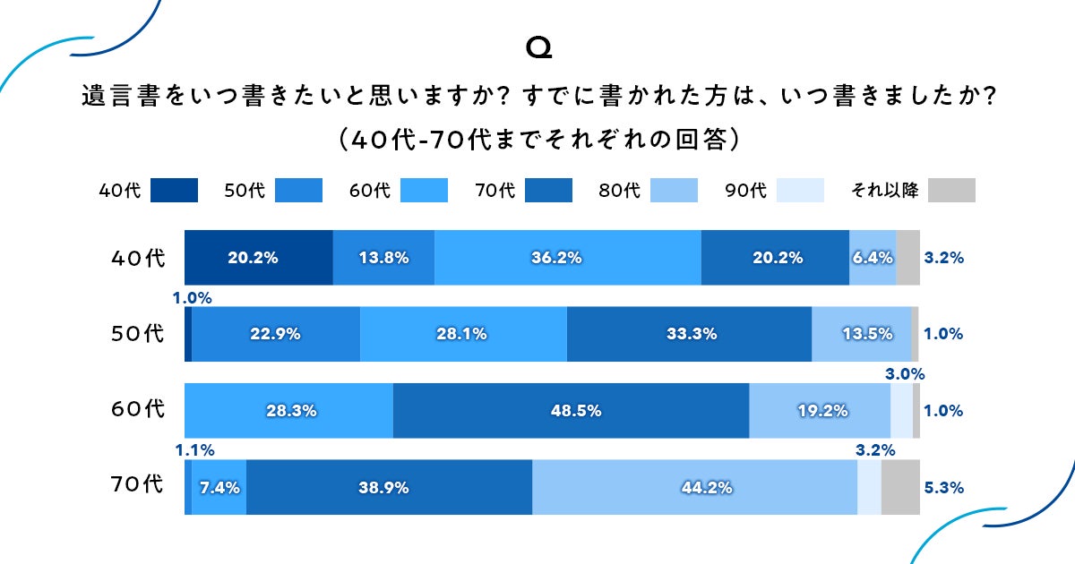 ・遺言書については、各年代それぞれが、「自分はまだ書く年齢ではない」と捉え、作成が進んでいない状況が分かります。
