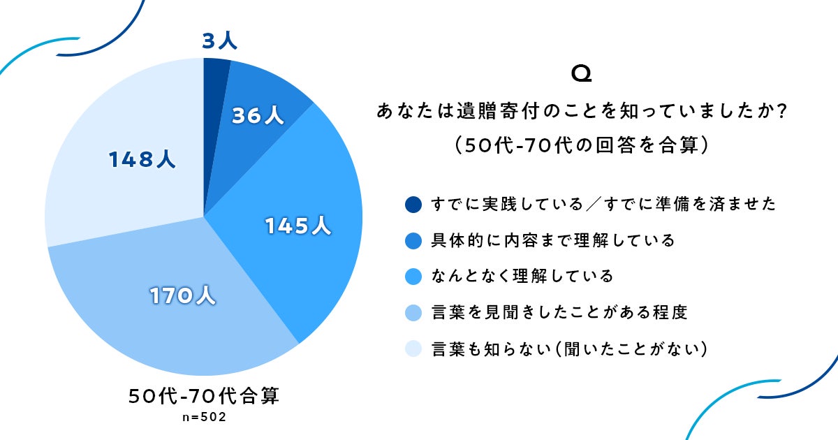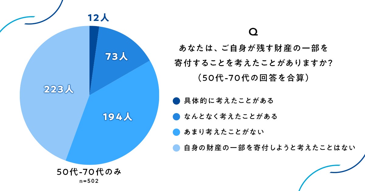 遺贈寄付に関する認知が増えている一方、遺贈寄付の実行意向は、まだまだ低水準です。50-70代においては、83%(417人)の人が、あまり考えたことがない、もしくは、考えたことがないと回答がありました。具体的に考えたことがある人は、12人と少数であることがわかります。