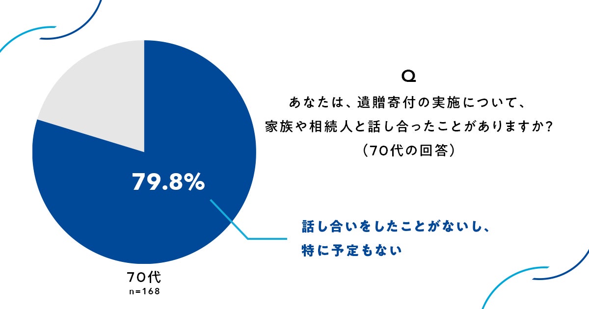 加えて、70代の79.8%が、「家族や相続人と遺贈寄付の実施について、話し合ったこともないし、予定もない」と回答。70代の意向度の低さが顕著に出ています。