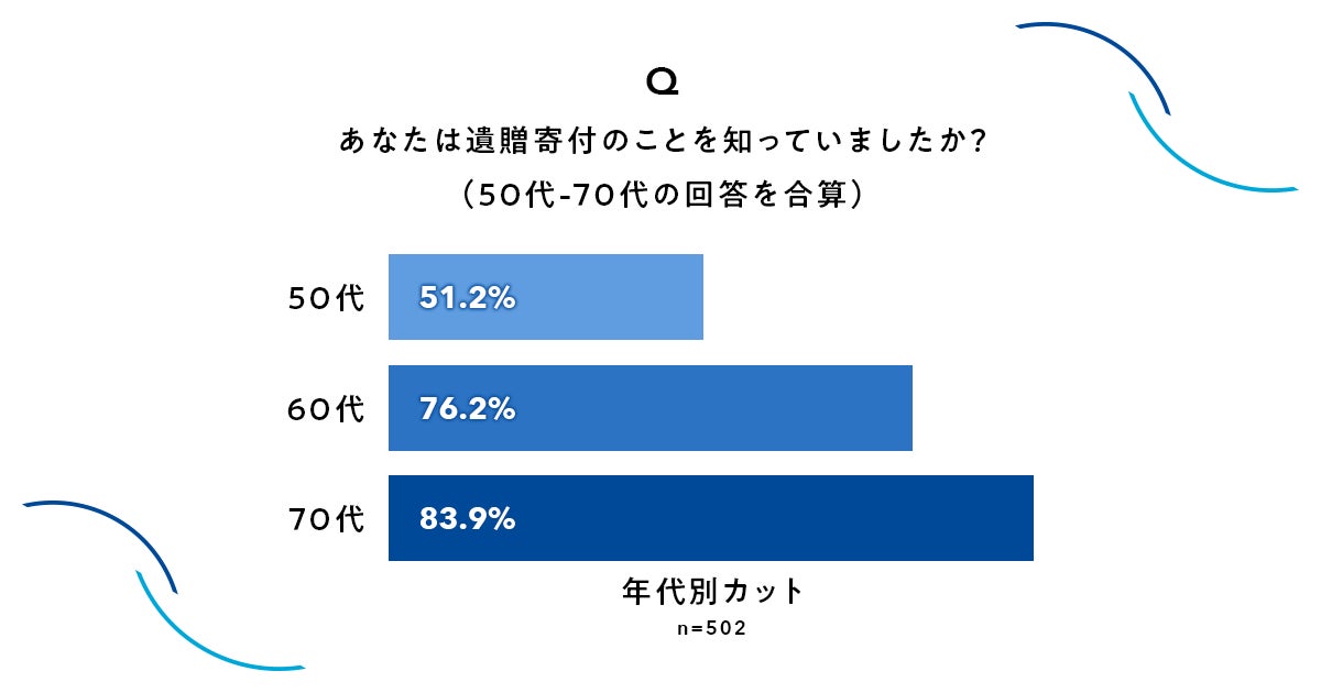 特に、70代に区切ってみると、83.9%の人が遺贈寄付を認知しており、この年代においては遺贈寄付が一般的なものになっていると言えます。