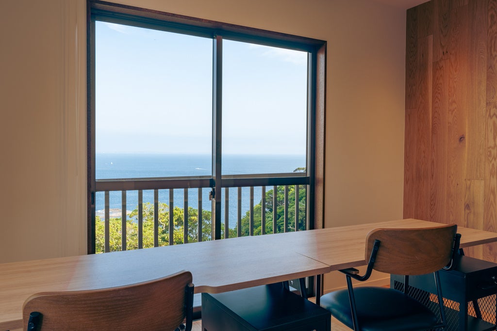 WITH SEA江の島では海を見渡せる位置にデスクを配置しております。心地よい海風と絶景を楽しみながら、集中して仕事に取り組めます。
