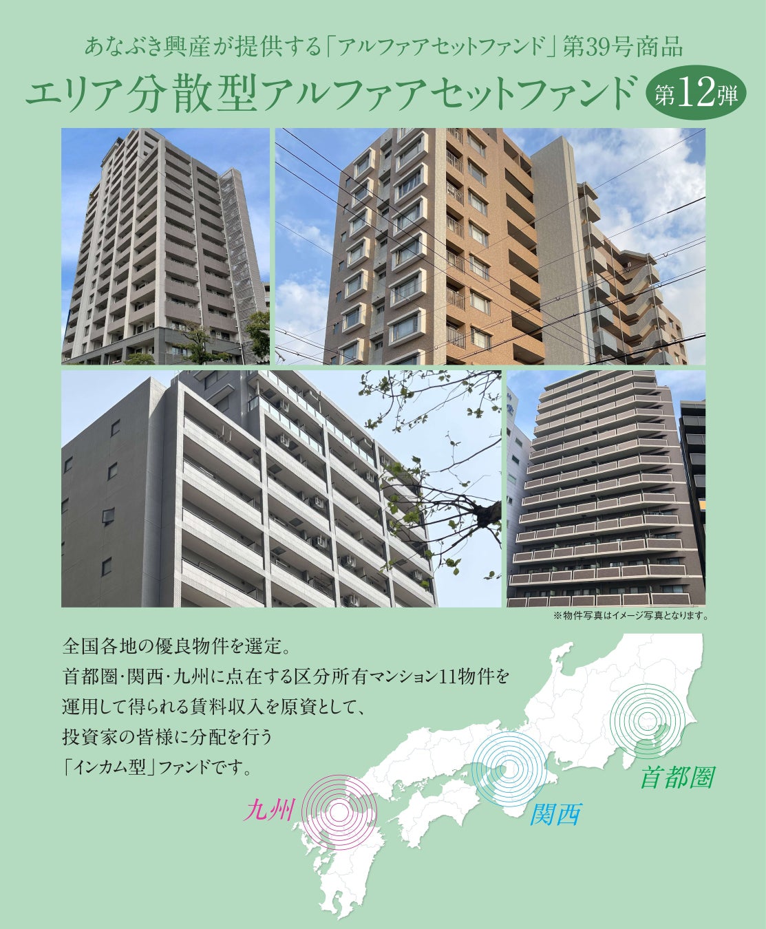 『エリア分散型アルファアセットファンド第十二弾』は、穴吹興産が全国で保有する物件の中から厳選した、首都圏・関西・九州に点在する優良物件11物件が投資対象です。賃料収入を原資として投資家の皆様へ配当を行う「インカム型」ファンドとなります。