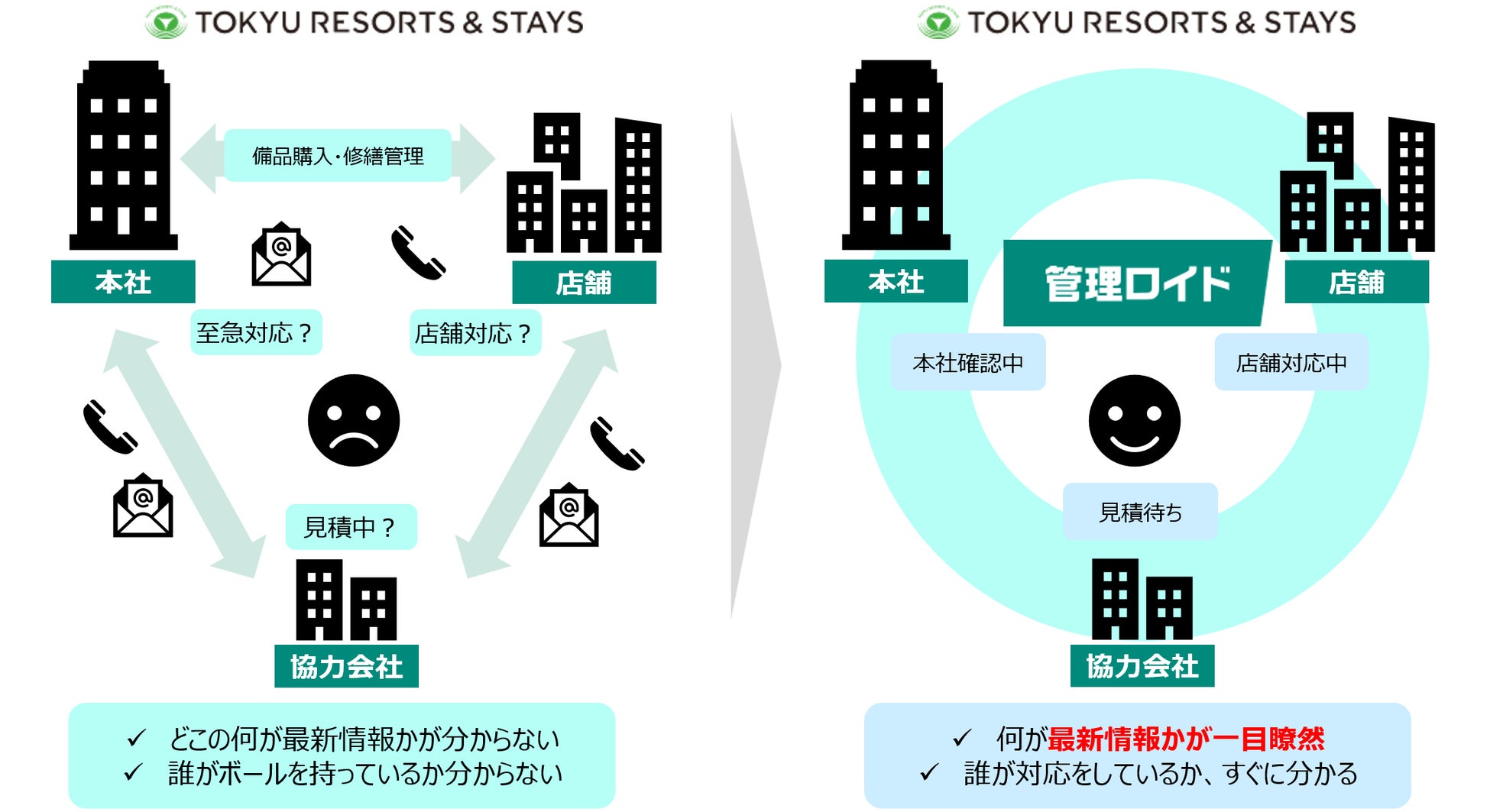 東急リゾーツ&ステイでは、全国で運営する「東急ステイ」の全31店舗で不具合が発生した際、本社、店舗および協力会社の3者間で、不具合の発生報告、修繕見積のやり取り、進捗状況の管理を、電話やメールなど様々な手段で行っていました。このため、最新情報の所在や誰が対応中なのかが分かりにくいという課題がありました。