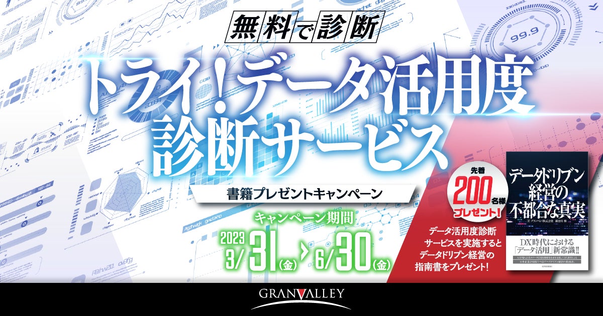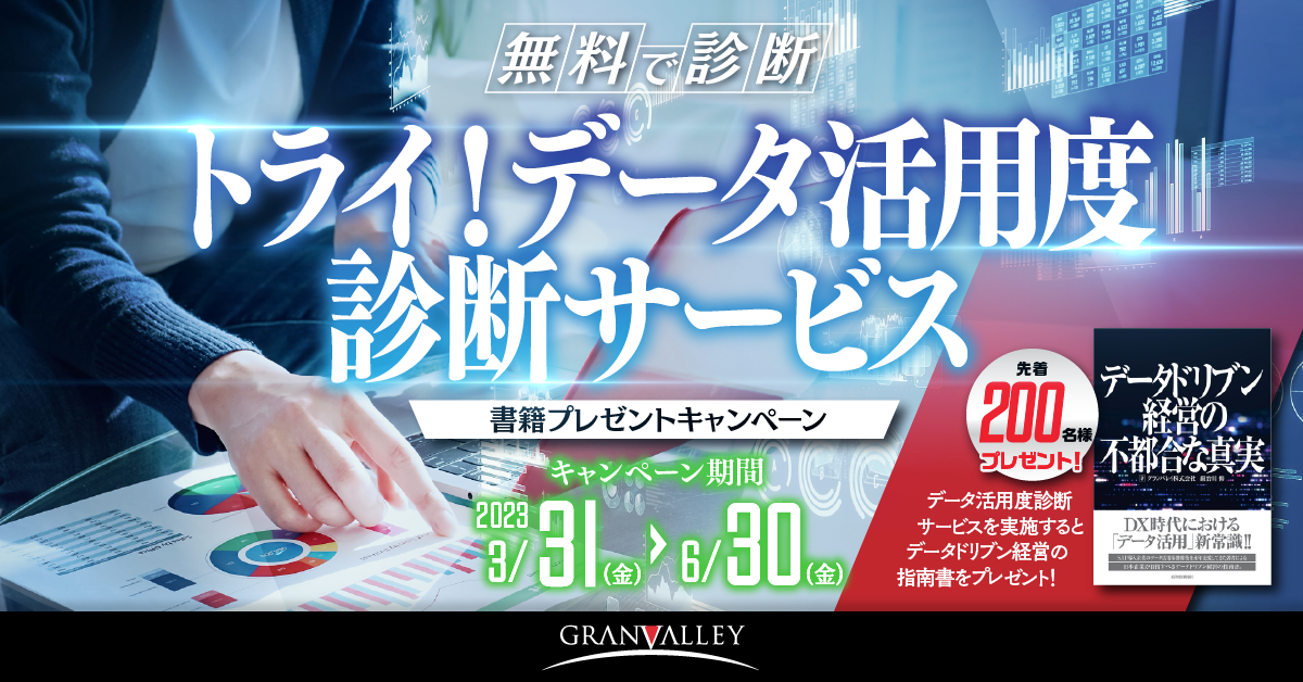 グランバレイ株式会社(東京都千代田区、代表取締役:大谷 泰宏 以下、グランバレイ)は、2023年3月31日(金)から6月30日(金)まで、企業のデータ活用度を診断する無料オンラインサービス「データ活用度診断サービス」を実施した企業担当者に対し、先着200名様にデータドリブン経営の指南書「データドリブン経営の不都合な真実」(出版:東洋経済新報社、定価:2,090円(税込み))をプレゼントする「トライ!データ活用度診断サービス書籍プレゼントキャンペーン」を実施します。