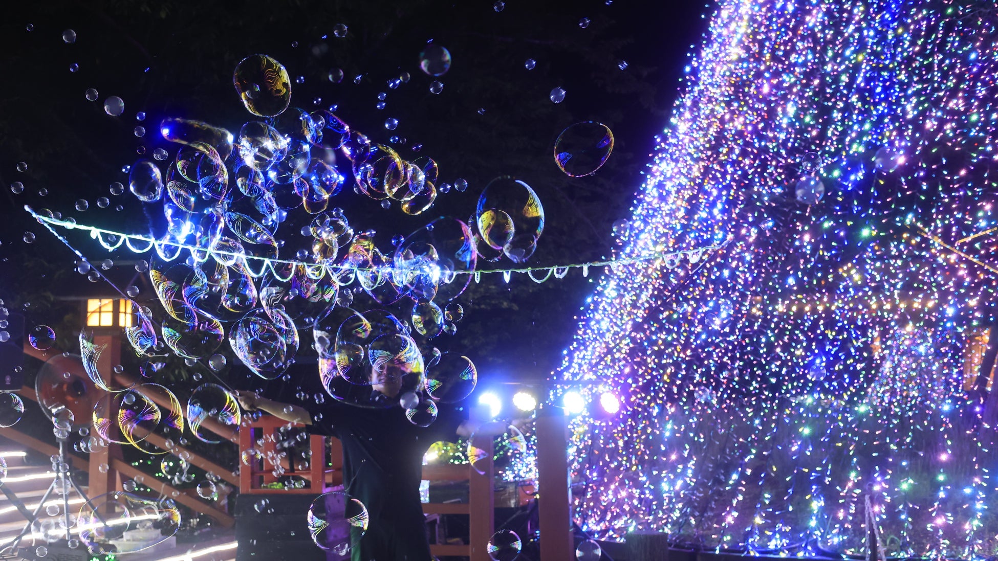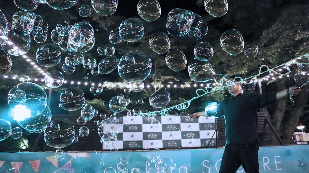 大人から子供まで楽しめる、夜空に浮かぶ幻想的な光のシャボン玉ショーを初開催!無数に飛び出す大量のシャボン玉や、人が入れそうな大きなシャボン玉まで、さまざまな種類のシャボン玉が煌めく光の中で揺蕩います。泡と光のフォトジェニックな空間をお楽しみください!