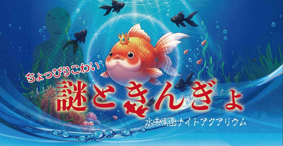 日本一の金魚水族館として知られる水中楽園アクアリウムでは、なぞときイベントとして「謎ときんぎょ」を開催します。美しい金魚たちに囲まれながら、「ちょっぴりこわい」謎解きに挑戦できる新感覚のエンターテイメントです。黒金魚に書かれた呪文の謎を解き、金魚の王「キングョ」を魚餓鬼から守り抜こう!