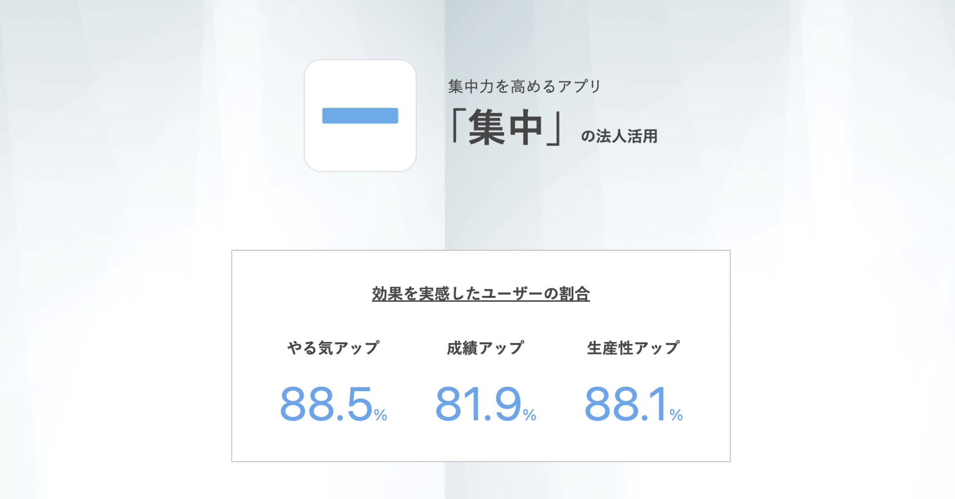 「集中」 は、元データアナリストが 「勉強や仕事に集中できない」 という心理を徹底分析して開発したアプリで、ユーザーの80%以上が 「成績・生産性がアップした」 と回答しています。法人活用の用途としては、学校・塾の生徒の自主学習、リモートワーク推進企業の従業員の自己管理のサポート等が見込まれます。