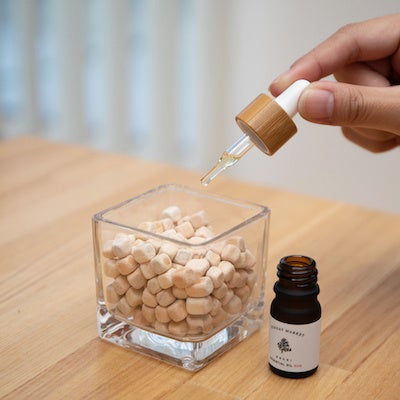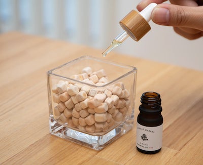 フレッシュで清涼感のある香りが特徴の高知県産「土佐ヒノキ」を7mm角の粒状にした天然フレグランス。添加物は一切加えていないので、自然そのままのヒノキの香りを楽しめます。
