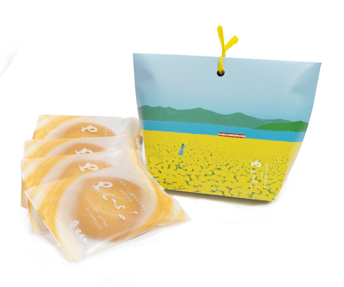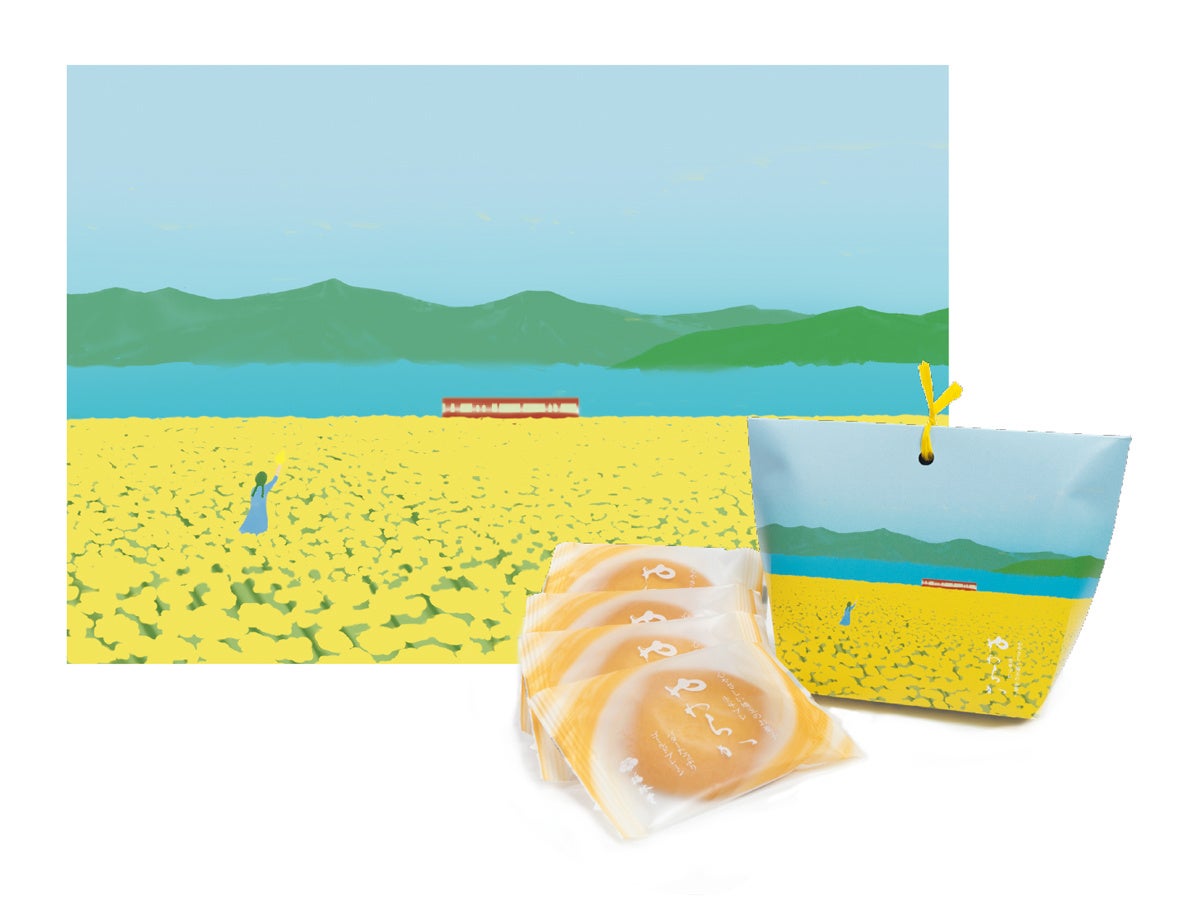 やわらかのお菓子作りで大切にしている「一袋のお菓子におかあさんの心をそえてあげること」。そんな母のあたたかさは、まるで太陽のよう、という気持ちを込めて、少年(シゲル)が山で過ごすある夏の1日を、太陽がやわらかく見守る風景を描いています。(いえだゆきな氏)