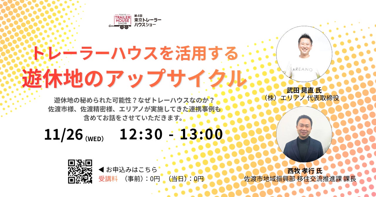 日本国土の多くが遊休地となっていますが、この遊休地の中には、観光資源、商業資源、住宅資源となる潜在能力を秘めた土地もあります。これらの土地の潜在能力を引き出すことに、車両であるトレーハウスは適しています。本セミナーでは、遊休地の秘められた可能性などについて、新潟県佐渡市様、佐渡精密様、エリアノが実施してきた連携事例も含めてお話します。