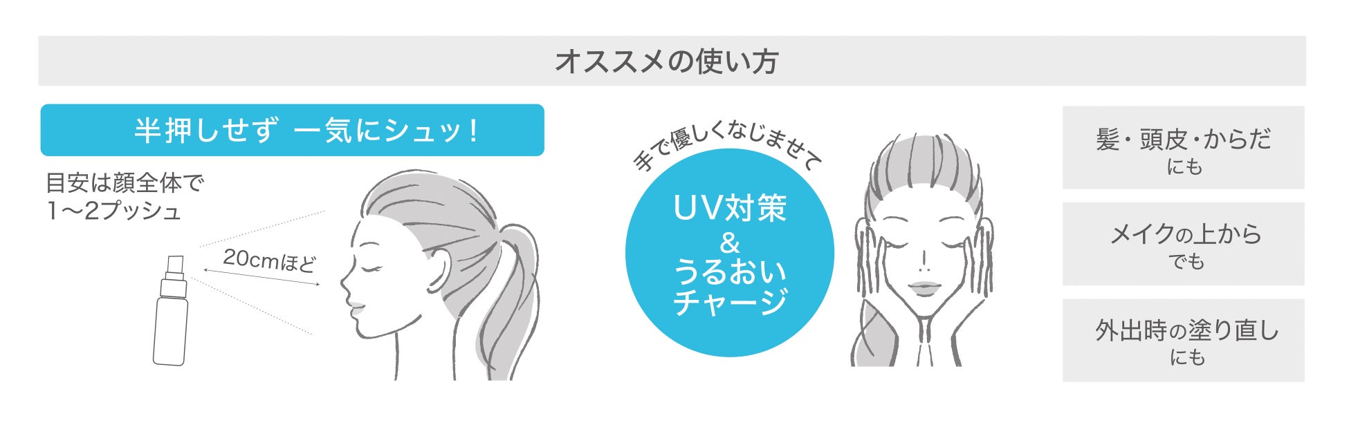 ●肌から20cmくらいはなし、目・口を閉じて顔全体にスプレーし、手で優しくなじませてください。(顔全体で1~2回プッシュが目安です。