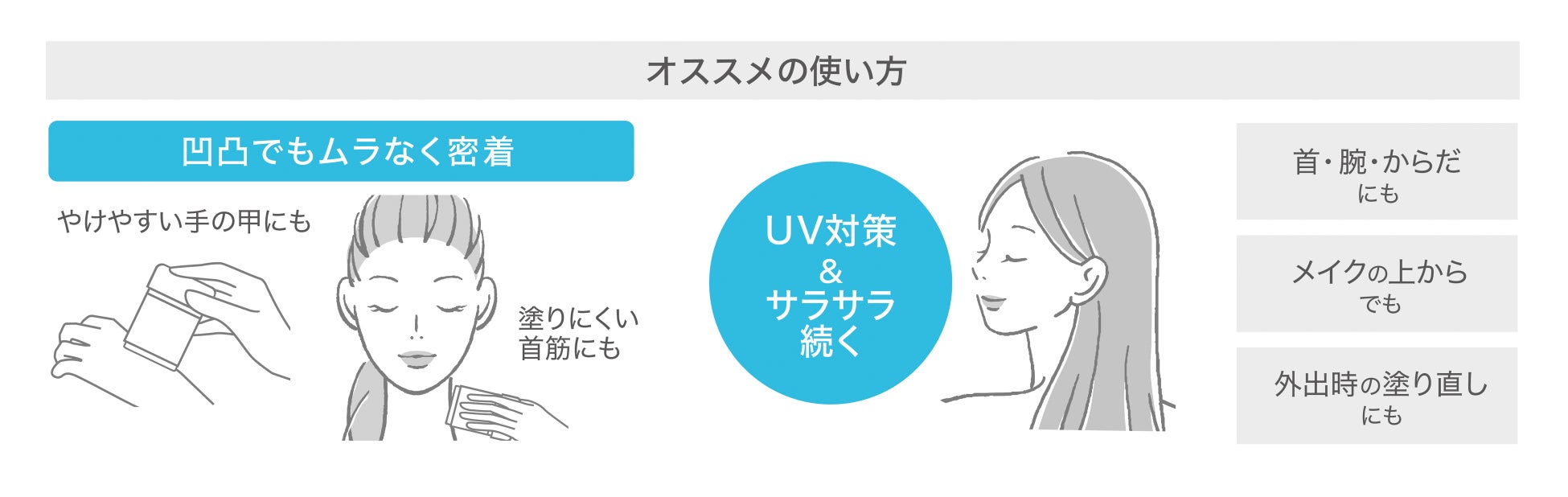●少量ずつ手にとり、塗り忘れのないよう肌にムラなくのばしてください。