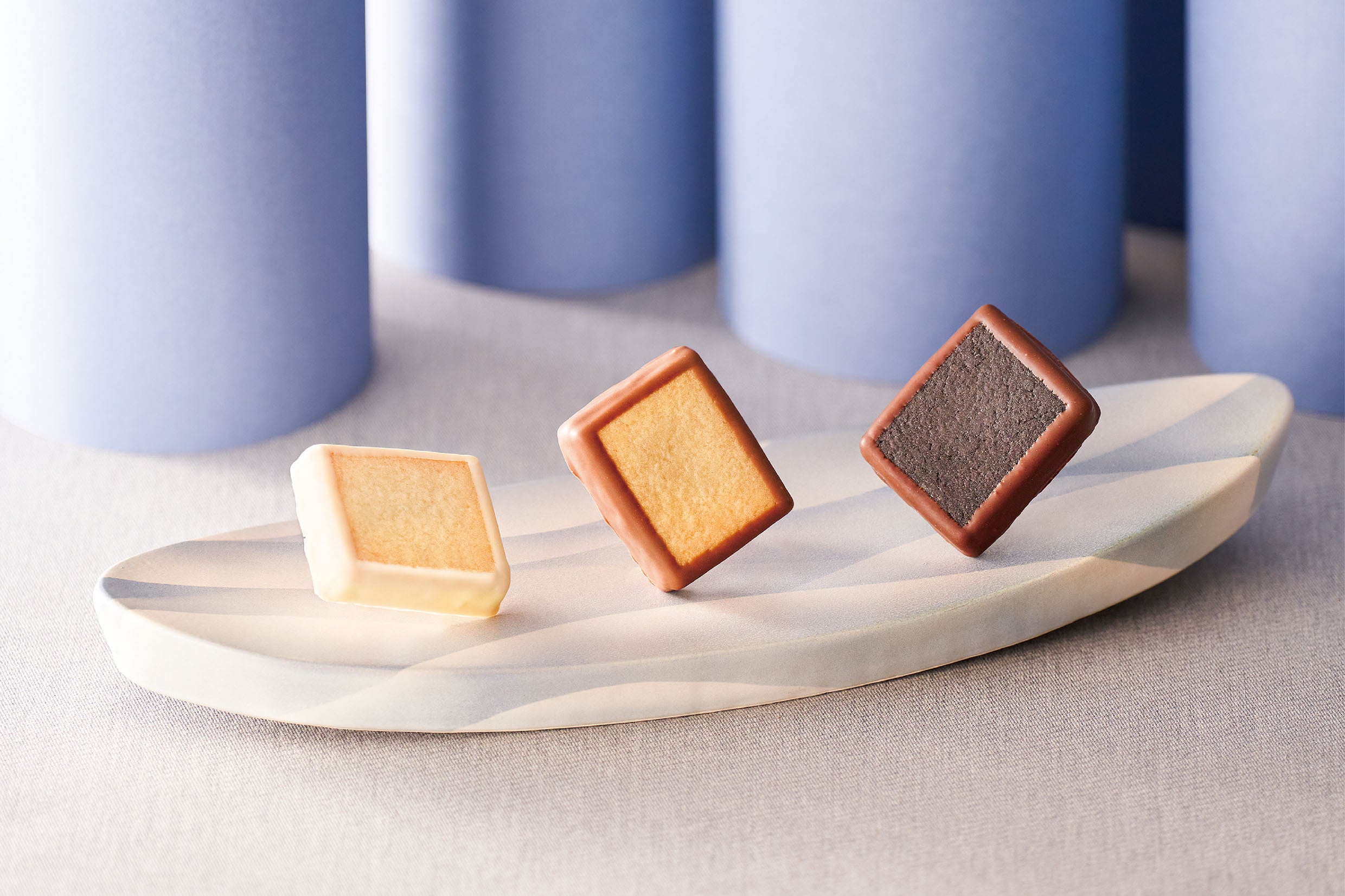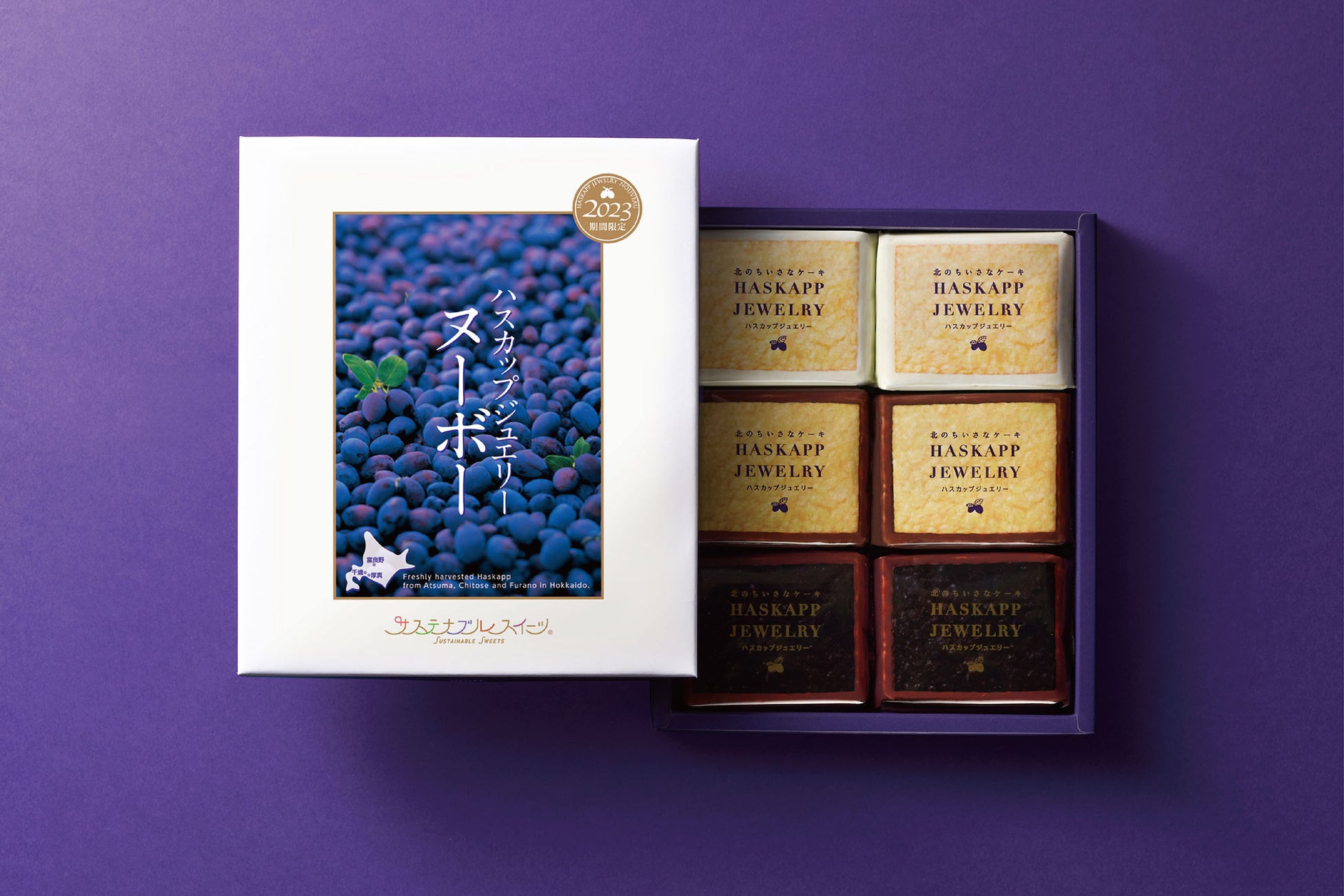 「北のちいさなケーキ ハスカップジュエリー」は、宝石のように希少で繊細な北海道ならではの果実を使用し、1978年(昭和53年)に誕生しました。ハスカップで作るジャムと北海道産バターで作るバタークリームを薄焼きクッキーでサンドし、クーベルチュールのミルクチョコレートで縁取りしています。職人が持てる技術のすべてを注ぎ込み生み出した、しっとり食感のケーキのようなスイーツです。