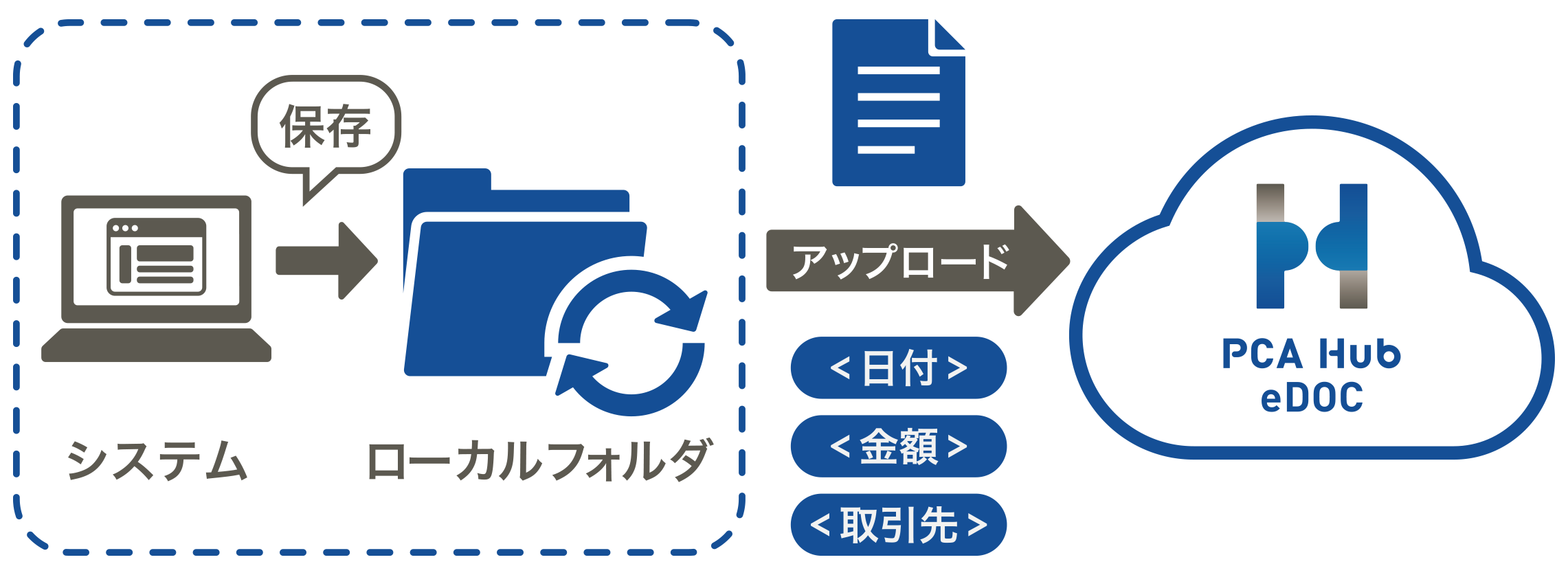 『PCA Hub eDOC アップロードツール』は、ファイルのアップロードの他、ユーザー定義プロパティへの登録機能を実装していますので、請求書や領収書等のファイルと合わせて取引日・取引先・金額などの記録項目を『PCA Hub eDOC』に自動登録することが可能になります。