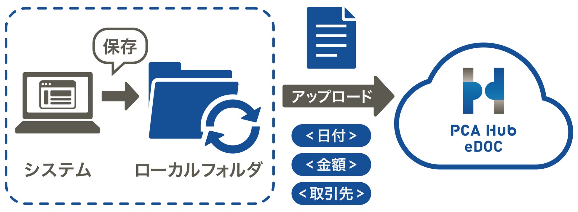 『PCAクラウド』や『PCAサブスク』をはじめとするサブスクリプション型基幹業務システムを開発・販売するピー・シー・エー株式会社(代表取締役社長:佐藤文昭 本社:東京都千代田区 プライム銘柄コード9629 以下:PCA)は、電子帳簿保存法に対応した証憑電子保管サービス『PCA Hub eDOC(ピーシーエー ハブ イードック)』の標準機能として、パソコンのローカルフォルダに保存されているファイルをクラウド上の『PCA Hub eDOC』に自動アップロードするデスクトップアプリ(eDOCアップロードツール)を2023年5月31日(水曜日)より、弊社ホームページからダウンロードする事ができるようになりました。