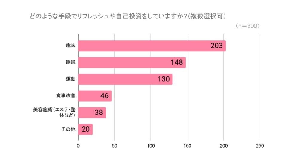 「どのような手段でリフレッシュや自己投資をしていますか?(複数選択可)」(n=300)という質問に対して、「趣味」が203件で最も多く、次いで「睡眠」が148件、「運動」が130件と続きました。
