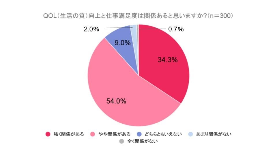 「QOL(生活の質)向上と仕事満足度は関係があると思いますか?」(n=300)という質問に対して、88.3%が「関係がある」と回答しました。