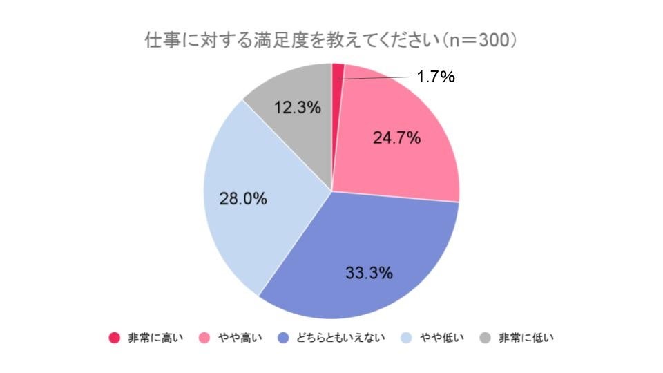 「仕事に対する満足度を教えてください」(n=300)という質問に対し、満足層(「非常に高い」+「やや高い」)は26.4%にとどまりました。内訳は「非常に高い」1.7%、「やや高い」24.7%となっています。
