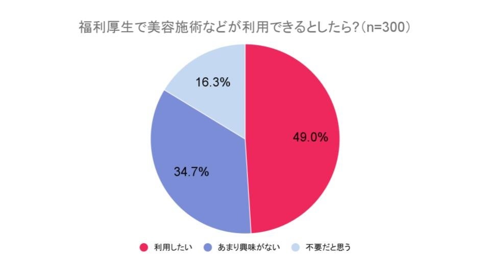 「福利厚生で美容施術などが利用できるとしたら?」(n=300)という質問に対して、49.0%が「利用したい」と回答しました。一方、「あまり興味がない」は34.7%、「不要だと思う」は16.3%という結果でした。